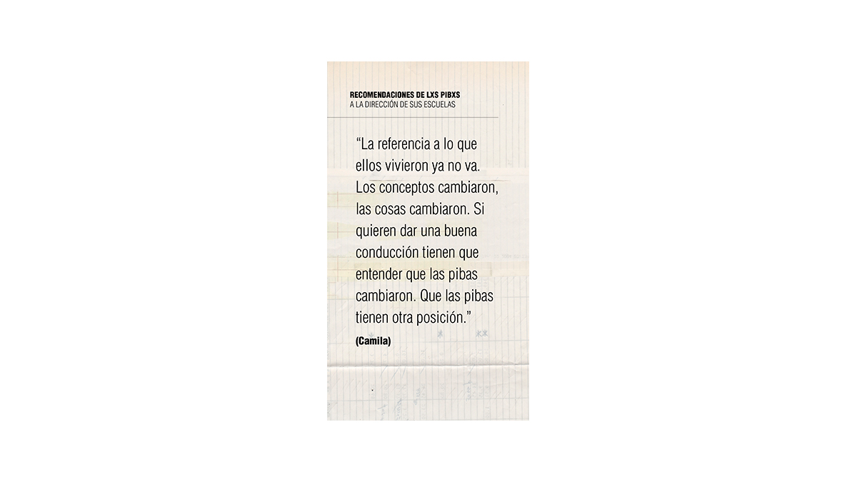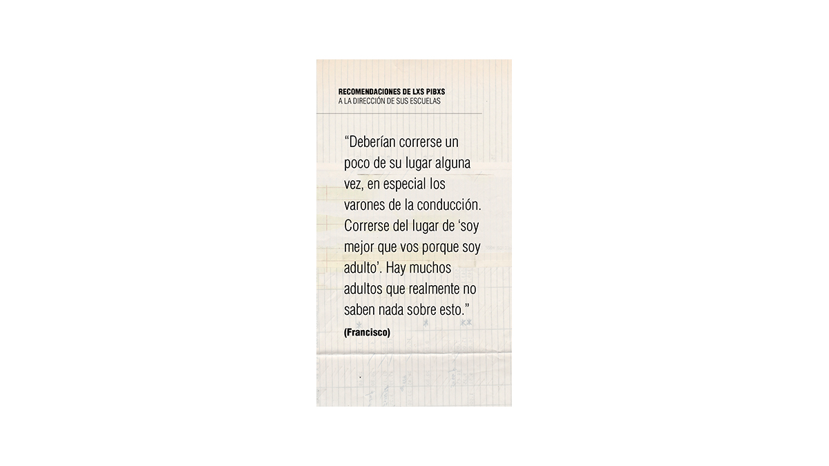 Los y las docentes que entrevisté coinciden en que el problema central en la actuación de la conducción se arraiga en la concepción que se tiene sobre el alumnado. “Cuando la escuela piensa las intervenciones, siempre las piensa de arriba hacia abajo: les vamos a decir lo que tienen que hacer desde un juicio: “ustedes se equivocaron” y “nosotros adultos sabemos qué hacer”. Las dos afirmaciones son falsas: ni los adultos sabemos qué hacer ni ellos necesariamente se equivocaron”, analiza una docente del Pellegrini.