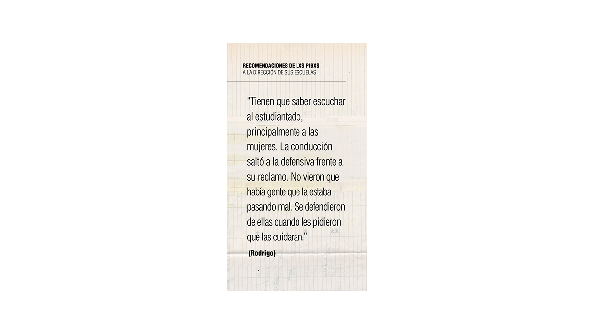 En cuanto a mí, en más de 20 años de trabajo sobre géneros, masculinidades y educación sexual, es la primera vez que observo una comunidad que atraviesa un proceso de reflexividad (y deconstrucción) como lo hizo buena parte del estudiantado de estas escuelas. Los costos fueron altos, sí, pero allí radica la responsabilidad y el desafío de los adultos. Estar a la altura del proceso exige escuchar a las pibas y a los pibes, correrse de la propia experiencia, reconocer una transformación de modos de vivir y niveles de autonomía que nada tienen que ver con nuestra adolescencia. Se trata de acompañar, contener y facilitar la creación de respuestas colectivas. Sin olvidar que hay protocolos para seguir, equipos para formar, educación sexual para implementar y derechos para respetar.