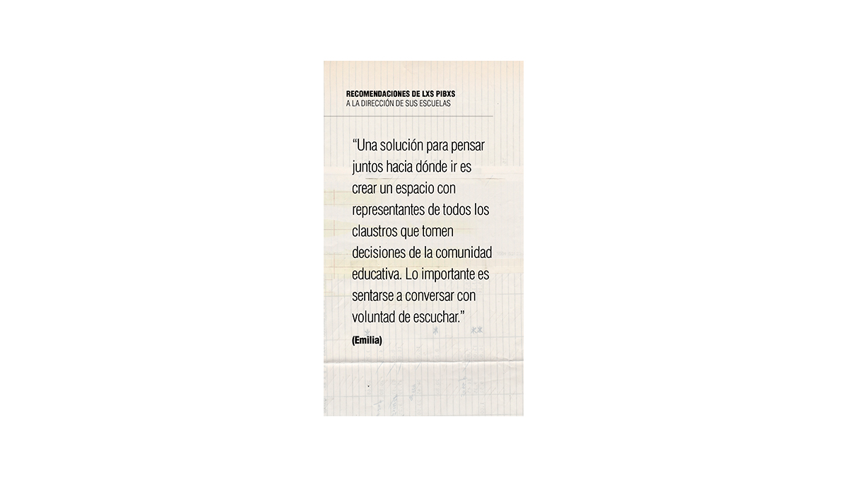 Las chicas y los chicos analizan con detalle la acción del mundo adulto. Algunas recomendaciones a la conducción de sus escuelas surgen al percibir que esos adultos están ensimismados en sus lógicas políticas y atemorizados por falta de empatía. Insisten en la necesidad de crear respuestas de manera colectiva, incluyendo las propuestas, las voces y las perspectivas del alumnado.