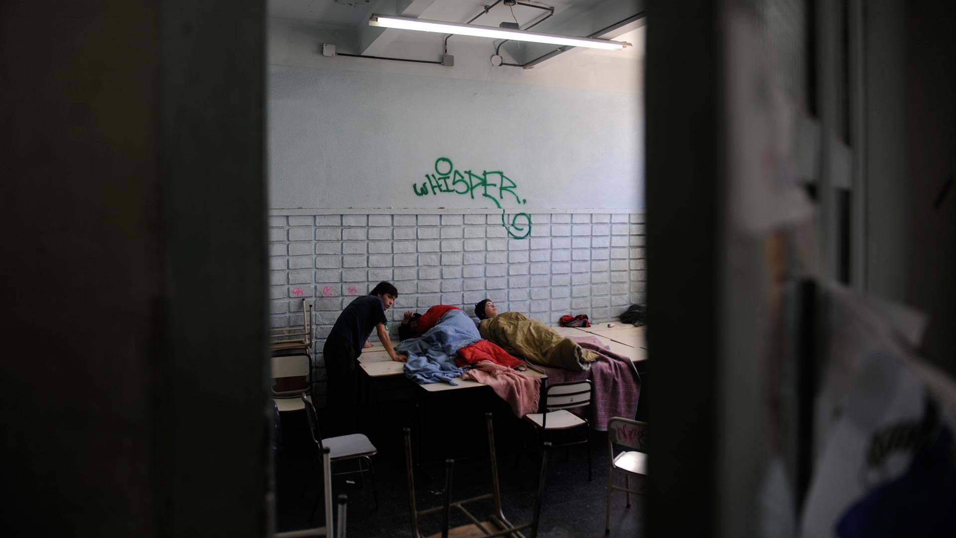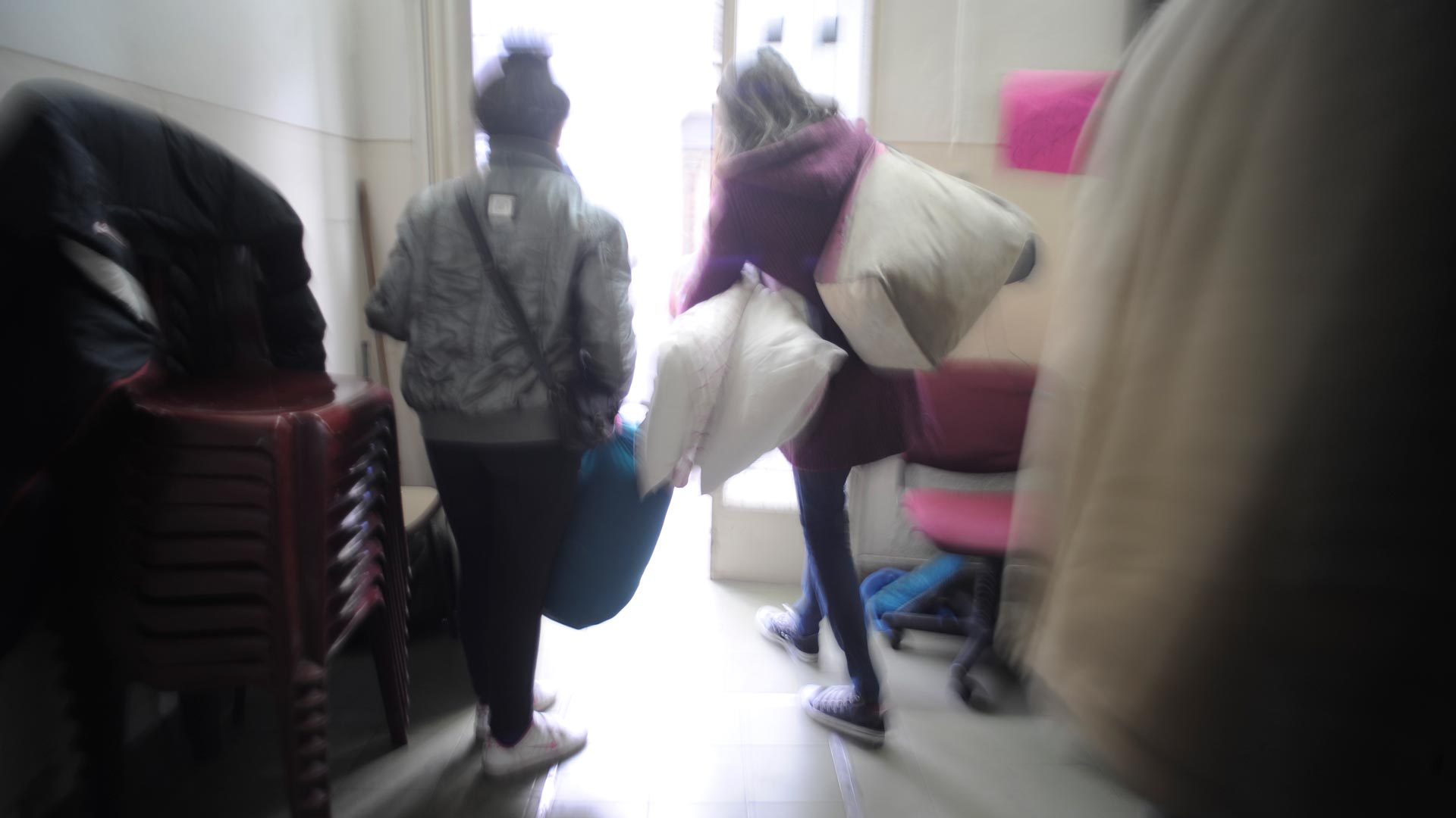 La mesa de recepción en el Nacional 17 de Caballito está a la derecha. La atienden chicos y chicas que ríen, que tienen el colegio para ellos solos. El informante es Jona y hay que buscarlo. El lugar luce a sobremesa, se oye cumbia, hay que devolver una pelota, esquivar un skate, llegar al patio y ver: un partido de vóley a la derecha; uno de fútbol a la izquierda. Hasta que aparece Jona, 19 años, cuerpo diminuto. En la sala de profesores, dos chicas tocan la guitarra. Se van. En un rincón hay un colchón enrollado, bolsas de dormir, frazadas, mochilas, aislantes. Entra un chico con una mochila, una bolsa de dormir, un aislante. Deja todo, se va.