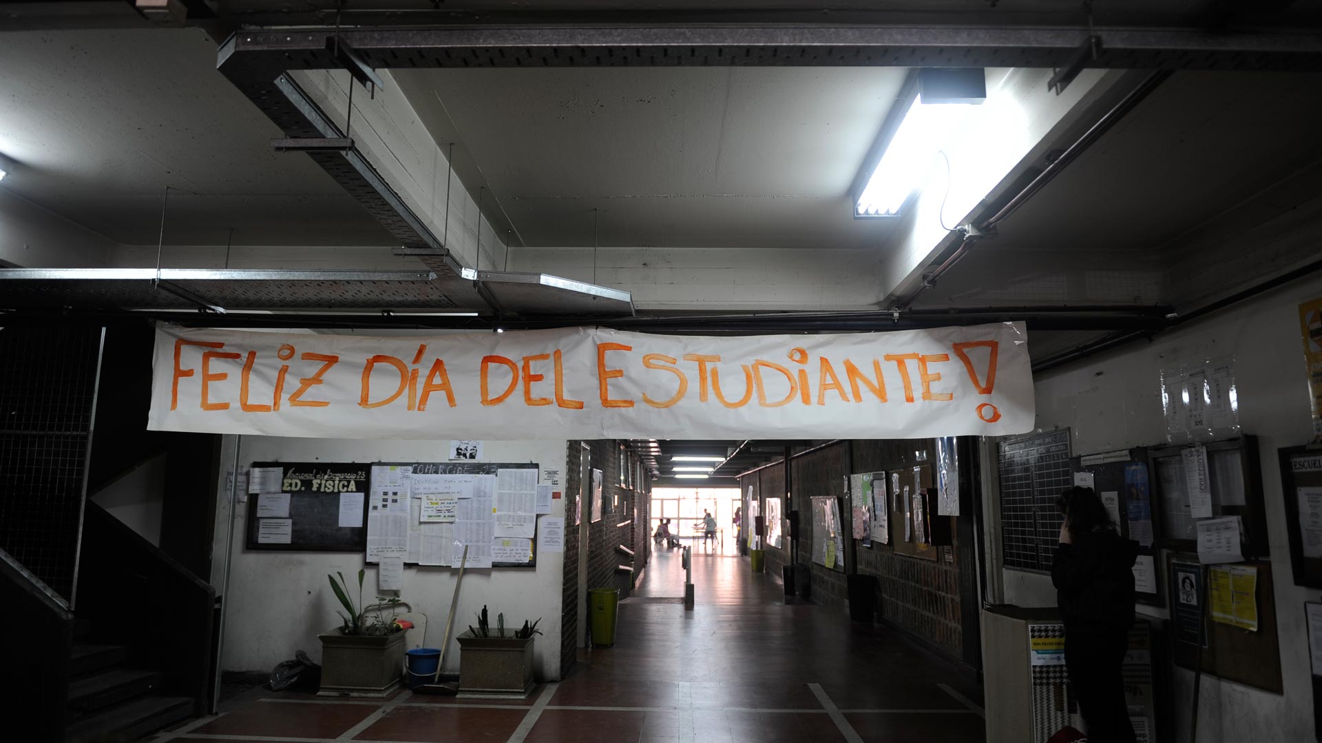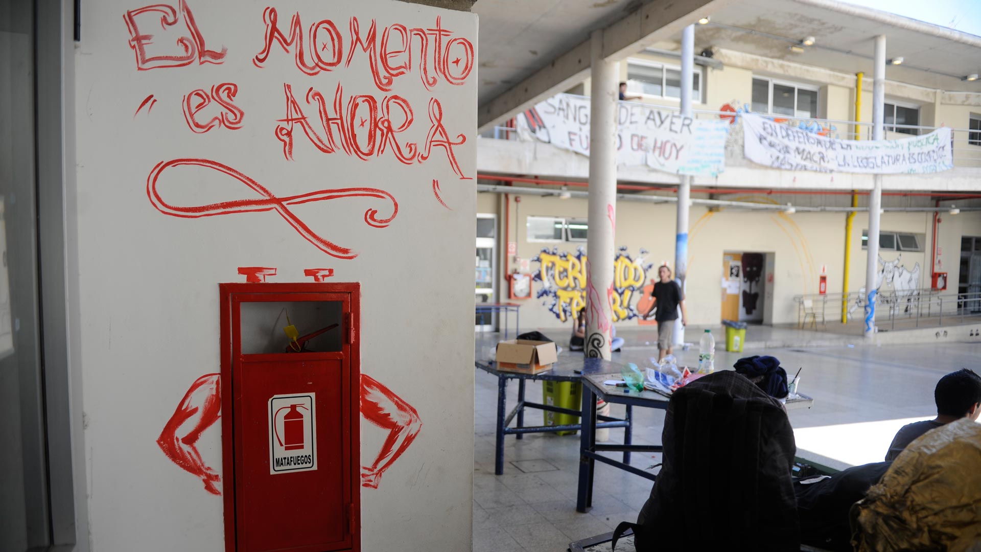 En la recepción, una pequeña sala donde duerme un estudiante, toman nota del nombre y apellido de la persona que entra. El edificio del colegio tiene más de 100 años y es así de bello. En la galería, debajo de los aleros, hay bancos, pupitres escritos, la bandera del centro de estudiantes. No son muchos ni hacen mucho ruido: hablan, miran, siguen hablando.