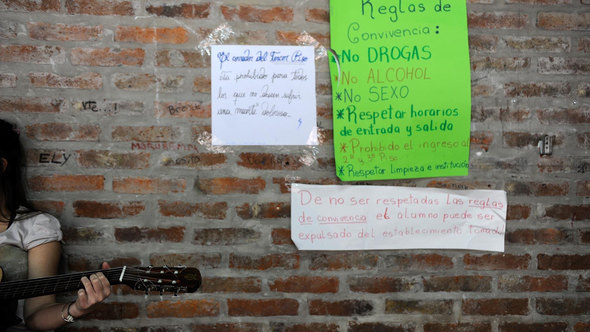 Ernesto quiere estudiar bellas artes y sociología, “además de trabajar”, agrega después. Renguea hasta la puerta; el chico que estaba sentado a un costado sigue ahí. Prendió un cigarrillo. Ernesto le dice que no se puede, y antes de apagarlo contra la pared, el chico le da una última pitada.