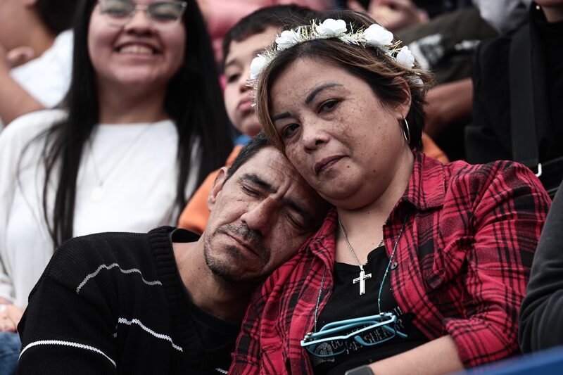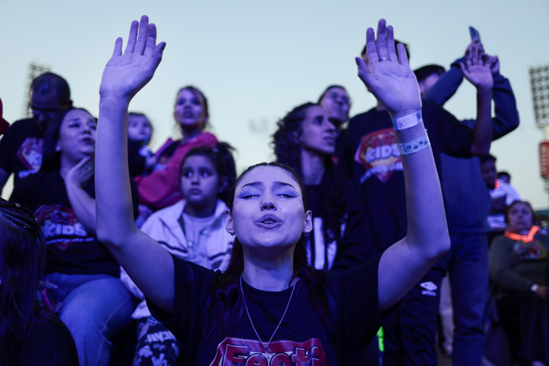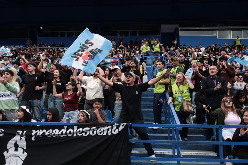 Las plateas están llenas y de ellas cuelgan trapos cristianos: sobre blanco, Jesús te ama Laferrere. Sobre una bandera argentina, Avivamiento Centenario. Una chica, sentada en una silla del campo, pincha una milanesa con un cuchillo y la deposita en un pan cortado en dos mitades para hacerse un sanguche. Un niño pequeño que no llega a los dos años, parado pero con cierta inestabilidad, se agarra de la silla en la que está sentada una señora que sostiene un mate. Otro niño entra corriendo al estadio al grito de “soy libre”: en algunos minutos comenzará el FestiKids con un despliegue de danza y canciones cristianas para los más pequeños. El momento empieza con una que sabemos todos: Baby Shark, estridente, alegre y pegadiza, es coreada y festejada por el público.