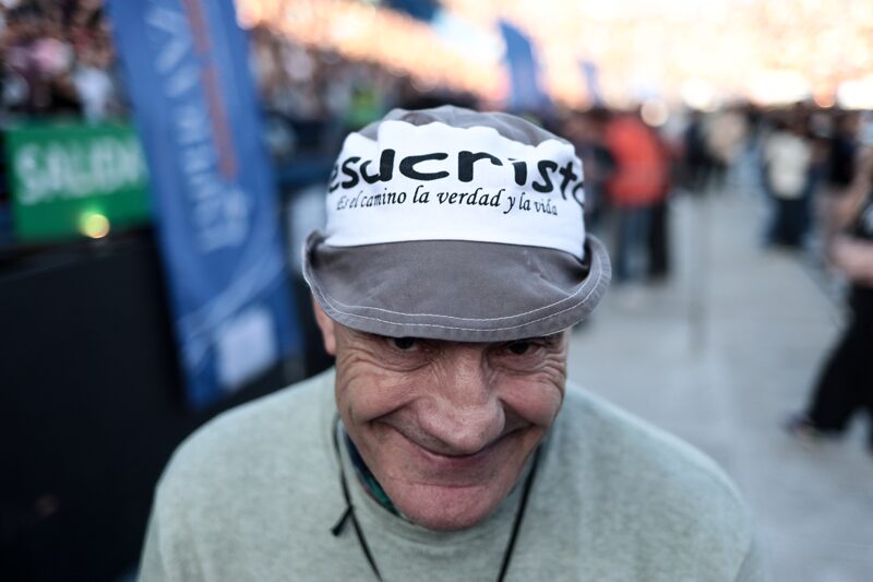 Todavía es de día, el cielo está cubierto de nubes. Aún falta un rato para que Franklin Graham haga su prédica. Antonia y Dora, cuñadas y jubiladas, están sentadas en dos sillas del campo, con una pechera amarilla que tiene escrito a mano “I. E. A. Mi redentor vive”. Llegaron hasta Vélez en micro, con su congregación, desde Rafael Calzada. Antonia era católica y su vecina, que ahora también es su pastora, fue la llave de entrada al evangelismo.