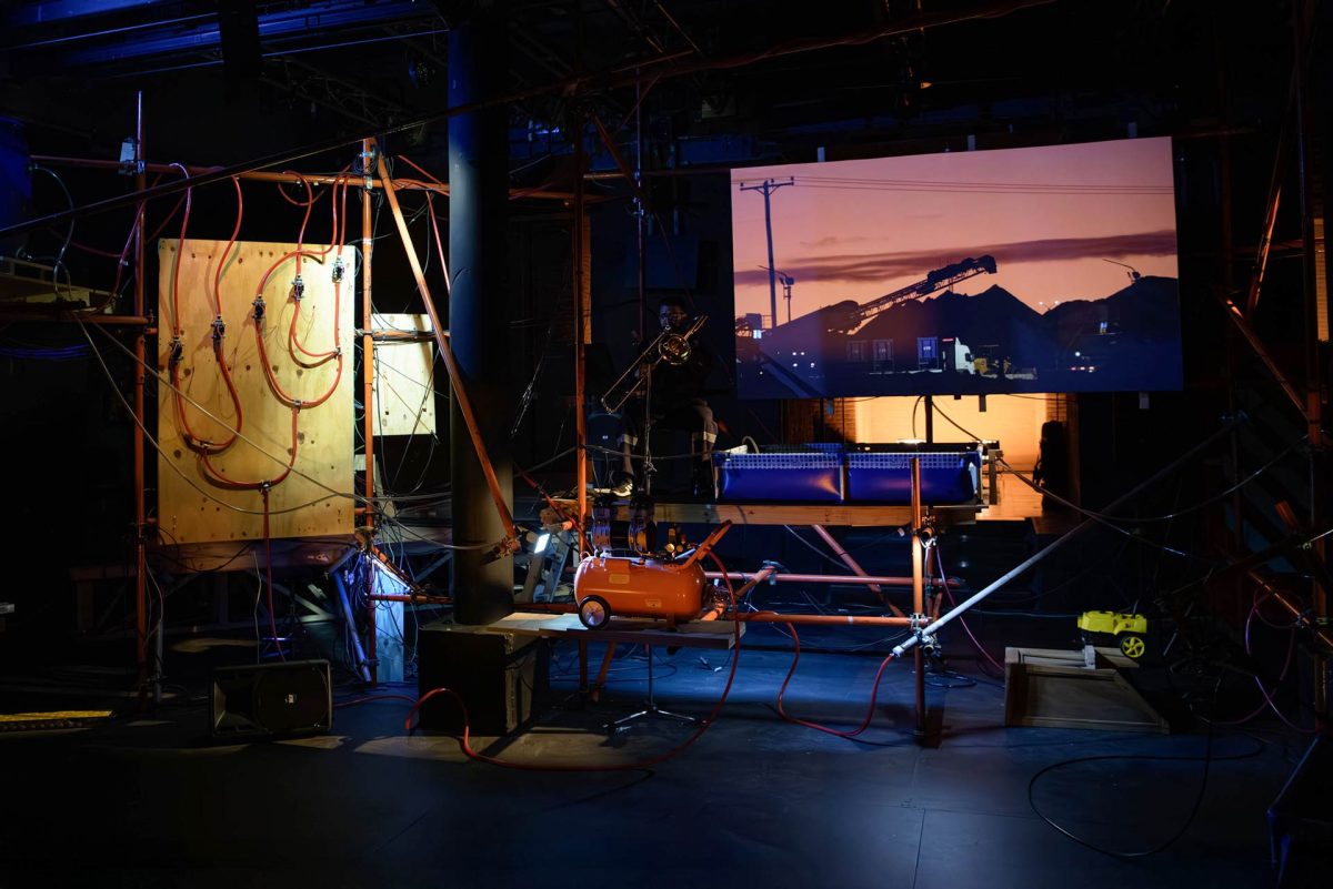 También hay primeros planos de las “anacondas”, mangueras que atraviesan la tierra como lava para sacar el agua de los ríos y redirigirla a la extracción del shale. Claro, eso emulan los caños naranjas del decorado. Los instrumentos de viento le ponen sonido ambiente a la escena. Junto con los caños, que tienen la arquitectura de un órgano tubular, simulan el viento de la Patagonia, ese viento único de la Patagonia, y el ruido y las explosiones de las máquinas penetrando el suelo. Un suelo que se logra partir con agua, la “fractura hidráulica”: el fracking.