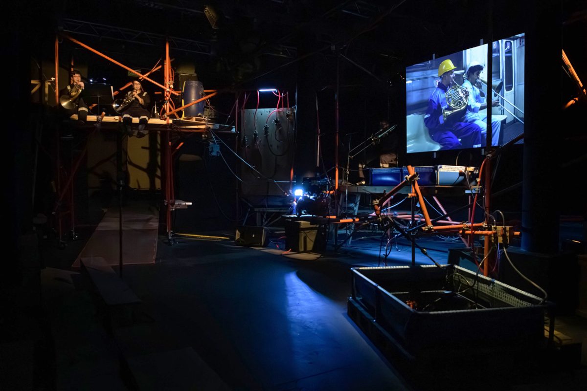 Para ver Geonnitus en el Colón hay que entrar por Viamonte 1168, atravesar un pasillo con fanáticos de la ópera, bajar unas escaleras y por fin llegar a un enorme subsuelo tipo industrial. Oscuro. Nos ubican en unos bancos de madera rústica, de frente y al mismo nivel de una escenografía semicircular. Andamios. Dos pantallas. Dos pelopinchos llenas. Caños y tubos que corren paralelos y se cruzan -parecen mapas de las líneas de subte-, y terminan en una bomba de agua o quizá siguen hasta las piletas. En la penumbra, brilla el bronce de instrumentos de viento sostenidos por músicos vestidos con mamelucos de la empresa YPF.
