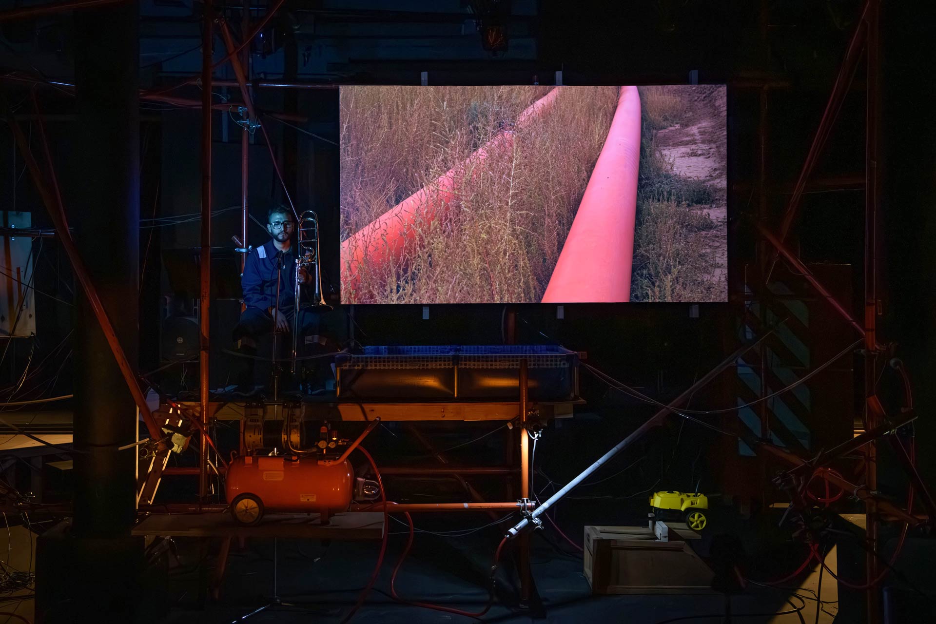 Geonnitus muestra lo alevoso pero también lo invisible del planeta, la escala cuántica: los músicos y el sistema tubular también reproducen ciertos zumbidos inauditos para la percepción humana. Capas sonoras y visuales crean un clima melancólico, de ciencia ficción distópica. Imposible no recordar al viento que despeinó a Leila Guerriero mientras escribía Los suicidas del fin del mundo, o a las cadenas de bicicleta de Marcela Armas que, formando la silueta de México, se desangraban en petróleo, o las personas retratadas por Pablo Piovano en su ensayo Fracking en Vaca Muerta.
