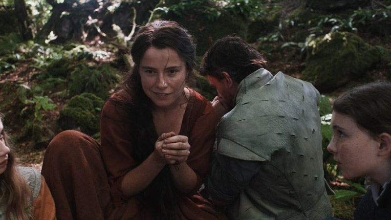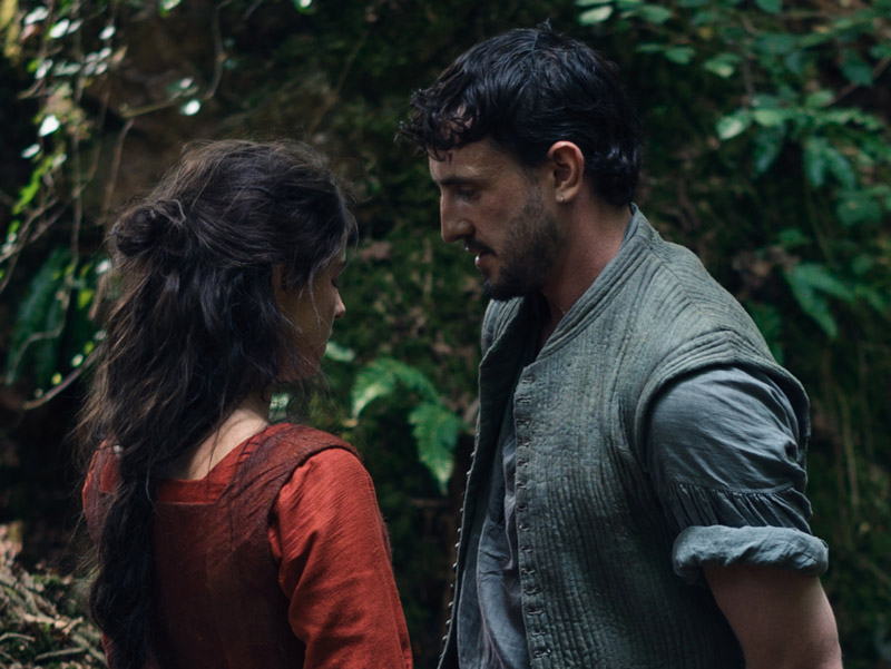 El nacimiento de la primera hija ocurre en el bosque. Agnes camina hacia su árbol. La cámara avanza más rápido que la puérpera dejándola por momentos fuera de campo. Como el trabajo de parto, la cámara se impone y avanza, Agnes entra y sale. Las contracciones se encuadran desde lejos, Agnes se retuerce en el piso, se toma de las raíces, grita. Toda la animalidad que la película le supone a la protagonista estalla en esta escena que culmina en un grito que el montaje corta abruptamente. Contrario a lo que podría leerse en la superficie, naturaleza y cultura se funden una y otra vez en Hamnet. Lo mismo pasa con otros binomios clásicos, civilización y barbarie, razón e instinto, ciencia y rito, vida y literatura. En la casa de Stratford, estos mundos se trenzan. El latín de los libros convive con el vapor de los ungüentos y la crianza de los hijos se convierte en el territorio donde el teatro y los ritos se encuentran en un lenguaje común. Habitan su propio mito: si Agnes es la que toca y sana la carne, Will es el que la narra. Él la mira como el músico mira a la ninfa: con la fascinación de quien sabe que ella pertenece a otro reino, uno que apenas puede acariciar a través de las palabras.