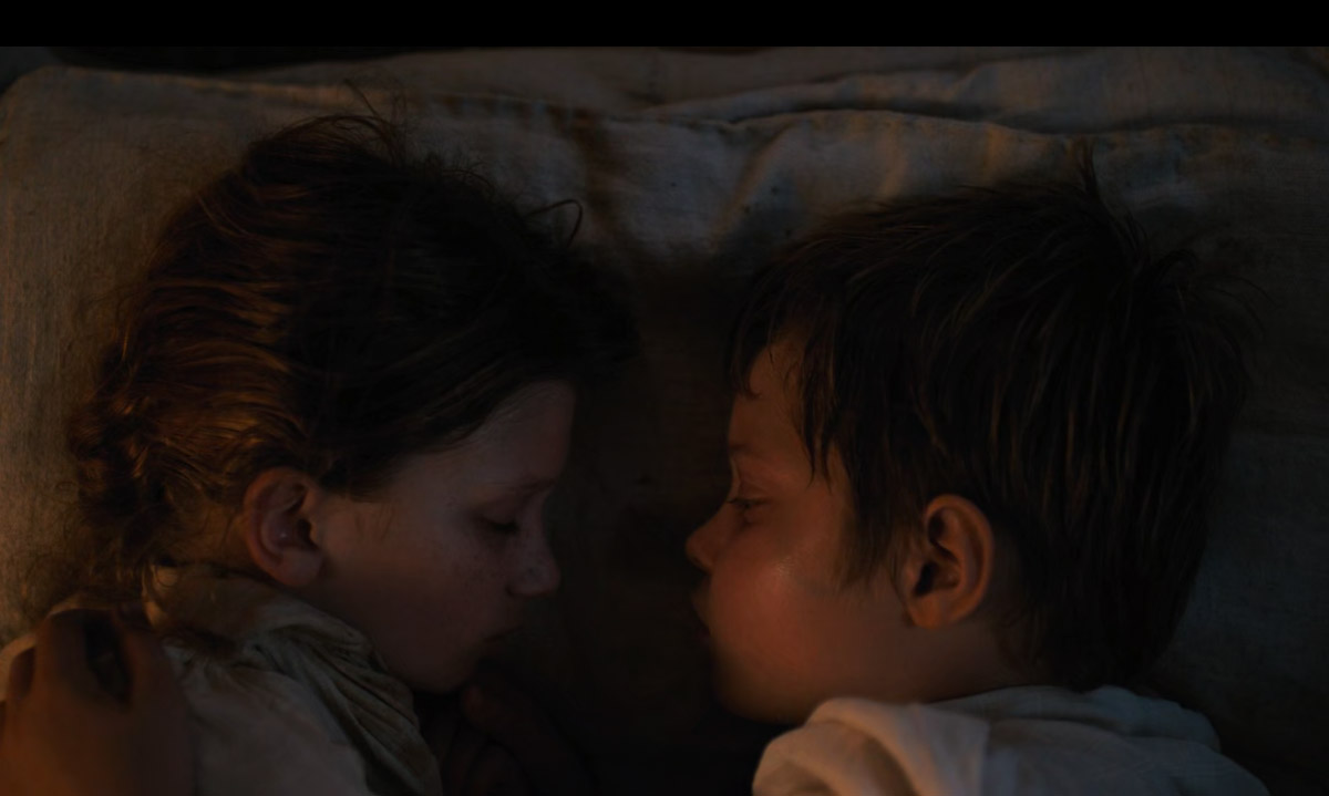 Por la noche Hamnet engaña a la muerte. “Te doy mi vida”, le dice a su hermana y se transforma esta escena en el gesto más shakesperiano de la película. El intercambio es la puesta en escena definitiva. El gesto tiene la lógica de una simetría trágica: una vida debe ser devuelta a cambio de otra. Hamnet engaña a la muerte usando el recurso más viejo del teatro de su padre: el doble. Si en el Acto V de Hamlet, el príncipe pide a su amigo que “reserve su aliento para contar su historia”, en esta habitación asistimos a ese pedido en silencio. Es el gesto más shakesperiano porque convierte el disfraz en destino: Hamnet se ofrece como sustituto, se coloca la máscara de la muerte para que su hermana pueda volver a la vida. “Seré valiente, padre”, repite el niño mientras conjura el engaño.