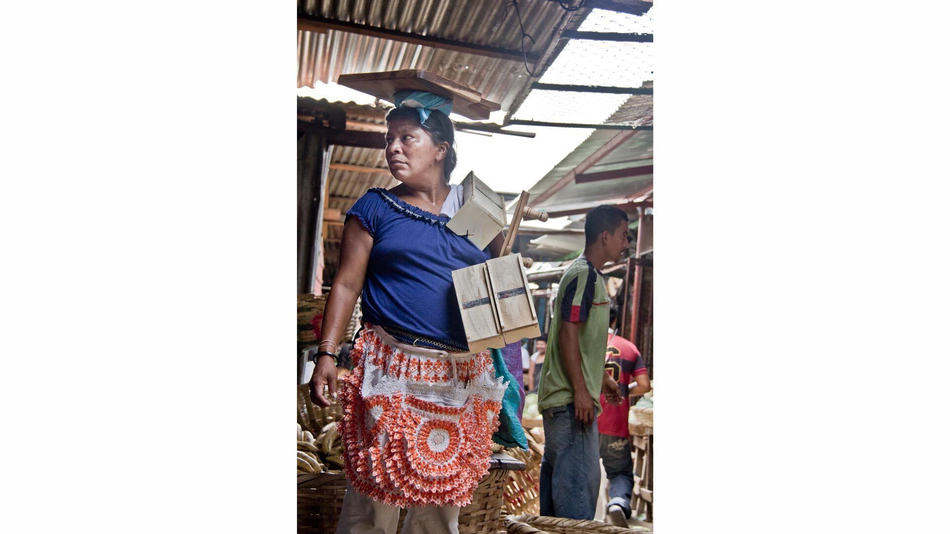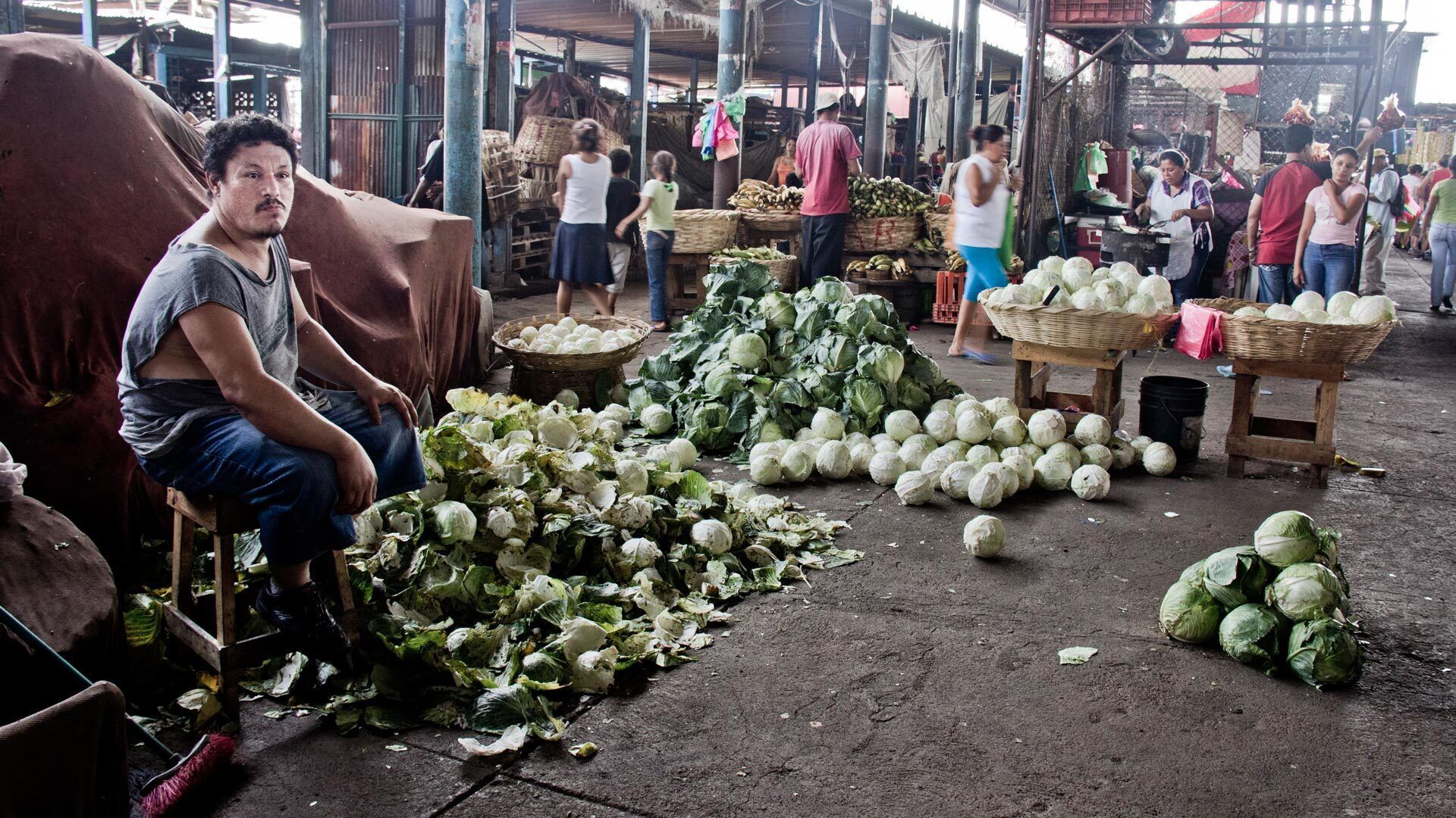 Marvin Artola camina rápido por los pasillos. Viste pantalón, camisa azul y botas. De la cintura le cuelgan un par de esposas. En la cabeza lleva una boina y en las manos un machete. Moreno y regordete, el sudor gotea desde su cara. Tiene 28 años y recorre el Mercado Oriental de Managua desde que nadaba en las aguas del vientre de su madre. Ella era comerciante y a él le tocó aprender a navegar en ese mundo.