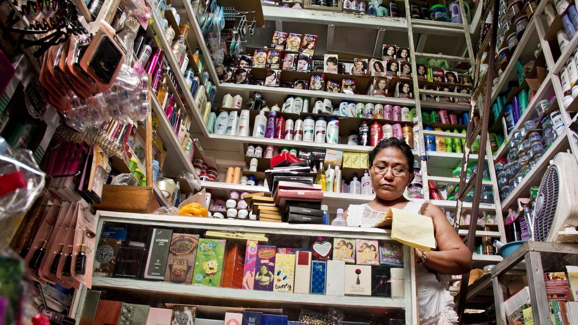 El tramo de María Lorena es el número 1727 de los 12 mil puestos fijos de venta que se registran. Es pequeño y está cargado de pinturas de labio, de uña, maquillaje, cremas de mano. Vende al por mayor.