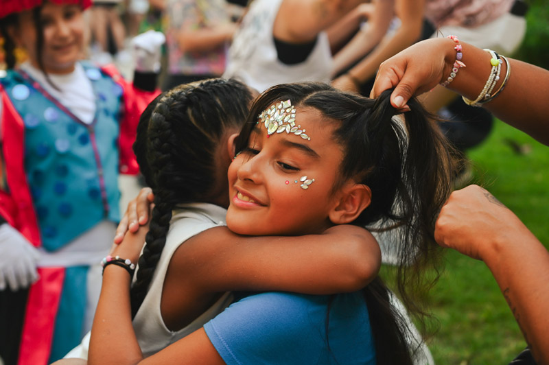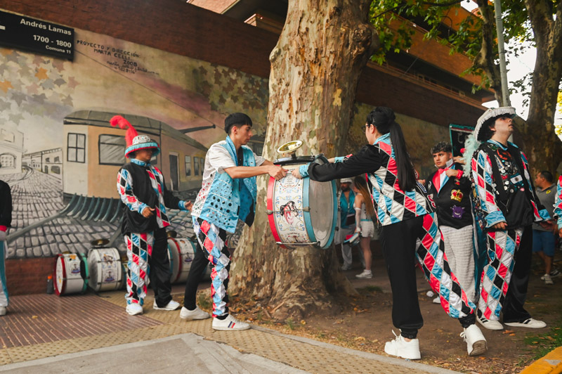 El tiempo pasa rápido entre un domingo de ensayo y el siguiente. El clima más benévolo de octubre invita a sumarse, pero para noviembre la murga ya es casi el doble de grande. Esta plaza —que supo ser una antigua estación de tranvías y fue espacio verde gracias a la lucha de los vecinos— y tantas otras en la ciudad empiezan a llenarse. Yo bajo con mi mate. Es la primera vez que vivo en un barrio con una historia tan rica —el tango, la literatura, el arte pintado en las calles— y pienso disfrutarlo. Hay otras siete murgas en Boedo, pero esta es la nuestra. Mamás y papás de las “mascotas” —los chicos entre cinco y doce años— hacen lo mismo que yo mientras sus hijos se divierten tirando pasos.