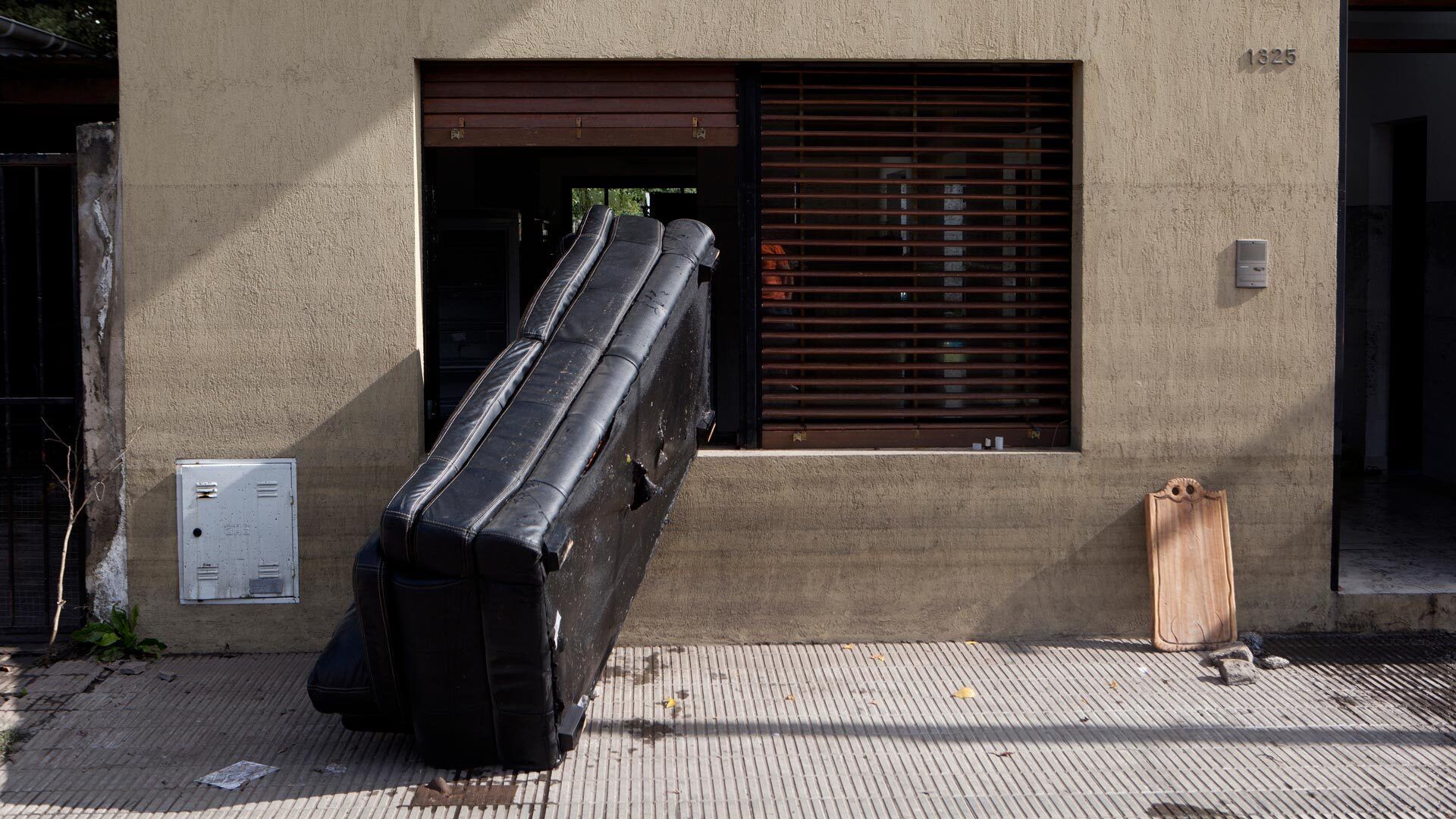 Terminan de sacar los pedazos del ropero. Después arrastran a la vereda una mesa de televisor reventada por la humedad. Y tres estantes, una mesa de computadora y una biblioteca. Todo de melamina.