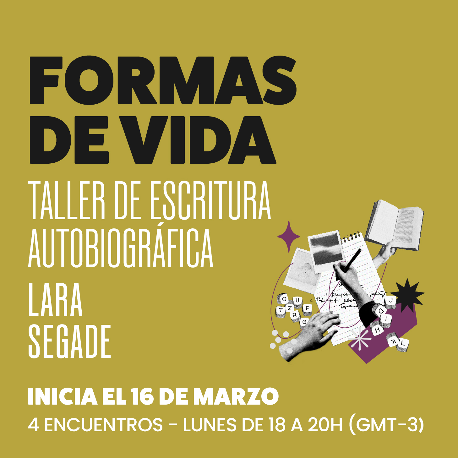 4 encuentros los lunes 16 y 30 de marzo, 6 y 13 de abril, de18 a 20h. (GMT-3)