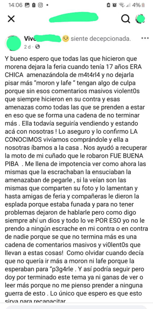 En uno de los tantos grupos de Facebook en los que se organizan las ferias de zona oeste, en estos días una chica escribió: “Y bueno, espero que todas las que hicieron que Morena dejara la feria cuando tenía 17 años, amenazándola con matarla y no pisar más Morón y Lafe, sientan algo de culpa”. Nacieron y vivieron en los márgenes pero también fueron expulsadas de esas mismas periferias hasta la muerte: del barrio, de la feria, de la esquina en Flores, de las fiestas que pretendían gestionarse.
