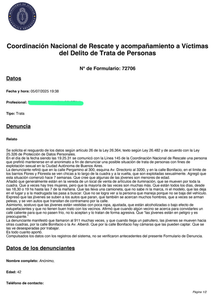"La denunciante refirió que en la calle Pergamino al 300, esquina Av. Directorio al 3200, y en la calle Bonifacio, en el límite de los barrios Flores y Floresta se ven chicas a lo largo de la cuadra y a la vuelta, que son explotadas sexualmente. Agregó que esta situación comenzó hace 7 semanas. Que cree que algunas de las jóvenes son menores de edad".