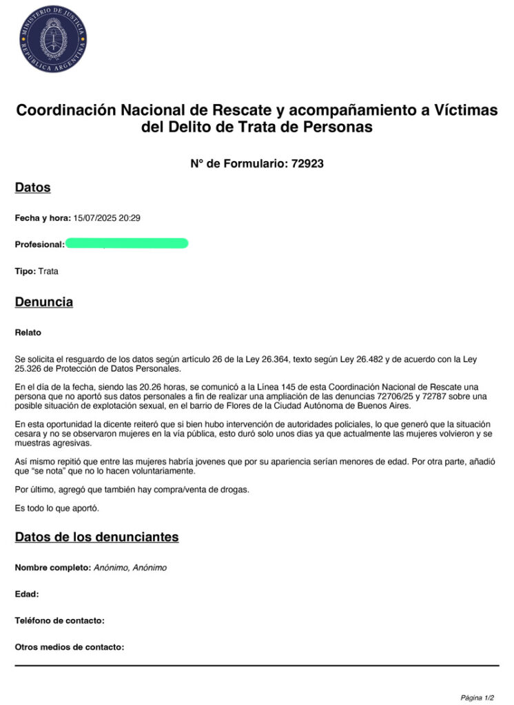 Las denuncias, en las que aportaron más información detallada como una patente de un auto, entraron en el embudo de la burocracia estatal: fueron registradas por una operadora y numeradas en los formularios 72787, 72706, 72923 y 72971. Antes de designarse un juzgado interviniente, la información pasa por la Procuraduría de Trata y Explotación de Personas (PROTEX), a cargo de Marcelo Colombo, que tiene seguimiento de patrones y características comunes de este tipo de delitos. En función de esa información los llamados se derivan a los juzgados y fiscalías.