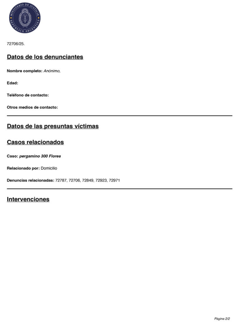 El 7 de julio, dos días después del primer llamado, los formularios se transformaron en un expediente -CFP 2739- ante la Cámara Nacional de Apelaciones en lo Criminal y Correccional Federal, que quedó radicado en el Juzgado Federal 8 a cargo del juez Marcelo Martinez De Giorgi. Los vecinos siguieron llamando y los empleados del ministerio siguieron abriendo formularios que fueron remitidos a esa misma sede judicial. En la causa se investiga trata con fines de explotación sexual. En la jerga judicial, este caso aparece “en trámite con instrucción delegada en fiscalía”.
